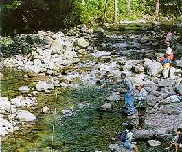 清流で水遊びもよし。川原の石を拾ってストーンメイキングもよし。自然の中には遊びがたくさんつまっています。 |