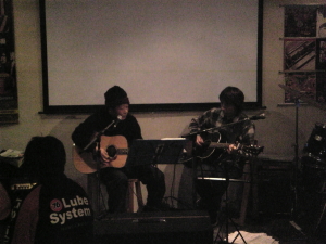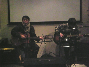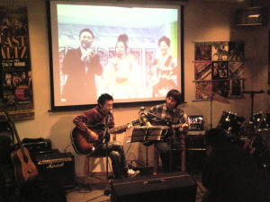 ◆山下祐輝&エディマツ 仕事納めのあと、お疲れぎみながら、来てくれた期待の「山下」くん、「術〜すべ」ほかを演奏してくれました。 疲れていた中ありがとうございました。 さすがに深夜で、仕事帰り、声はでないよね〜。 |
