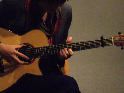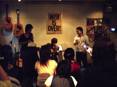 ◆ウタズキ&チャーリー 最後の曲は、ウタズキ「Father」をチャーリーのギターにのせて・・・。今回、終演後のアンケートでもかなり評判がよかったナンバー。 しぼりだすような「しゅん」のボーカルと「理」のコーラス、そこにチャーリーのリズムが加わったギターアクションが曲の雰囲気をつく出します。 リハーサルの際にあわせた程度ながら「ウタズキ」ヴァージョンとは違う、ひとつの完成系をみた感じ・・・。おそるべし。 観客全員がカメラを構えるという珍事に、おもわずこちらもパチリ!となってしまいます。
