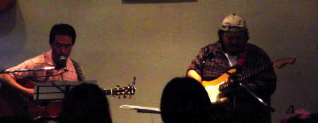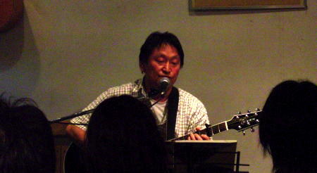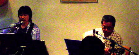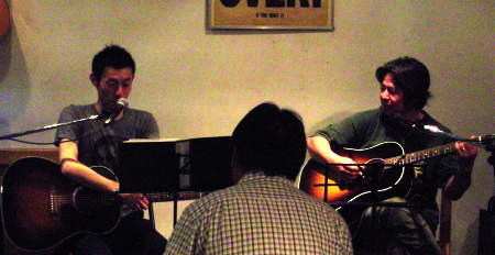 いつもと勝手が違うぞ〜という空気。最年少となるウォーリーは諸先輩方との重複曲というプレッシャーとフォークというやや未開の部分と・・葛藤の中、陽水を選曲。それがアダに!? トリを務めるナカミツ(写真手前・背)とのかけひきを繰り広げながらの2曲は、オリジナリティもいれながらの熱唱でした。 |