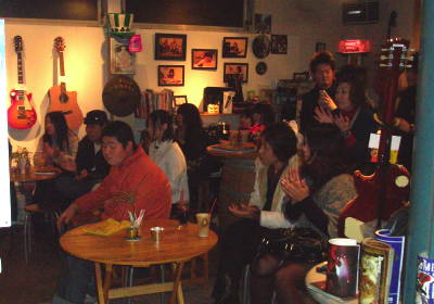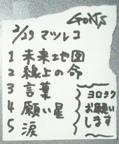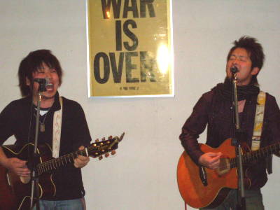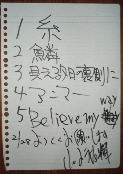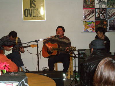 ◆山下祐輝(山鹿) 今回はカバー曲中心に、私のリクエストで「見える夕日の裏側に」を加えてもらい、更に、ず〜っとあたためてきていたという新曲「Believe my way」を含む5曲。 いつもの祐輝ワールドで進行したのに新曲が途中ミス?で本人はまったくの不出来という判断。 終演後もひたすら、歌詞とメロディを自宅にいるかのごとく弾き歌いの繰り返し、そのショックはかなりのものだったようで、次回リベンジとなることでしょう。 曲自体は詰まった言葉と字余り調がフォークソングっぽい感じでなかなかのものです・・・今回聞けなかった方はまた次回のお楽しみに。 |