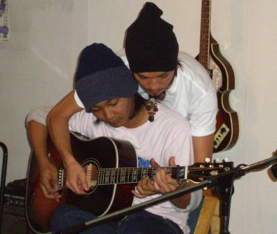 ◆RAIN.DOG(熊本) 注目の実力派・二人組。 今回は手慣れたステージング(しかし、以前はこんなしゃべったな〜)と、サポートで「松藤」さんが加わったナンバーなどで構成された内容。 ジプシースイング系のノリなどで独自性もしっかりアピール。 楽しいナンバーと聞かせる曲、コーラスなどで約40分。 途中、二人羽織り形式のマジシャン的奏法(写真)でオリジナル曲を披露、驚きのパフォーマンスでした。