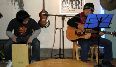 いつ通りのかしら節・・・だがフリ−ライブとはやはり勝手が違うぞ! 楽しいトークも交えながらで、曲の背景なども交えながら歌い上げます。・・が、飛んじゃいましたね〜もあったり、あれ?サポートの予定の彼がこない・・など、ハプニングもあったりしながらでしたが、じっくり聞かせいただきました。 カホンのサポ−ト(山下君)も心地よきかな。 演奏曲:人生の空から/思えば遠くへ来たもんだ/流星/落陽 |