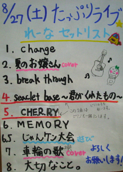 中三とは思えない、落ち着きと度胸、さらに存在感、なかなかおらん! そんな彼女、今回「たっぷり」ということで、奇策を考えてきました。 途中、ジャンケン大会なるサプライズも入れ込んだりしながら・・・。 オリジナルの出来も立派に、そして変化球でカバー曲もしっかりで、楽しませるのにも驚きと笑顔。会場を包んでしまう。 この夏でしばしは受験モードのハズが・・やはり回りがほっておかないようで、今後もライブ予定が入り、忙しいようで。受験は大丈夫か?と親心もでてくる。 ますます期待だ! そして中三ふたりユニットも今後楽しみな協力ユニットだ!◎