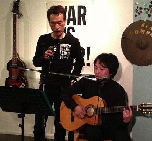 帰省で帰り着くや、即ライブという過酷な時間設定・・は、ご本人の勘違いから始まりました〜、が、基本、好きなんですね。とても楽しそうで・・。 以前のバンドの楽曲から、とオリジナル、更にローリング・ストーンズのカバ−などで構成した内容は、彼らしいステージ。歌声はあいかわらずボーカリストパワー全開、ギタースタイルも以前と変わらず、ある意味安心して聞けちゃうのです。 7曲でたっぷり汗ばんだあとは、2部に流れ・・・熊本のミック・ジャガーこと「菊川」氏とのコラボや、当方のギター教室の先生方2名が参加したり、妊婦「桂」のボーカル、そして「けいし」くんの「チャー」など、普段とは違うミュージシャン達の遊び場となり、時にコンガやトリプルギター、タンバリンなど、盛り上がるワイワイな流れ。 マツムラレコードの歴史がギュ〜〜ッと凝縮されたメンツで楽しめたのです。 演奏曲:家へ帰ろう(ロサリー・トリッパー)/ホンキー・トンク・ウイメン(ローリング・ストーンズ)/クールメン(Super HOW)/ジャンピング・ジャック・フラッシュ(ローリング・ストーンズ)/黒幕は誰だ(Super HOW)/裸のまま/フィ−リング 写真は 菊川&勇次 |
