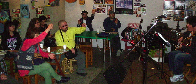 ◆ANDY(山鹿) 飛び入り枠ながら、定番2曲を、リズミカルに聞かせてくれます。 演奏曲:青春の影(チューリップ)/あの素晴しい愛をもう一度(加藤和彦・北山修) ◆健ちゃん尚ちゃんサイトウケン&Bethの聞かせるデュオが初始動! 演奏曲:水色の街(三輪車)/ひと足遅れの春(とんぼちゃん)/明治チェルシーの唄(ガロ)/二十歳のめぐり逢い(シグナル) 全員で:夢の中へ(井上陽水) |