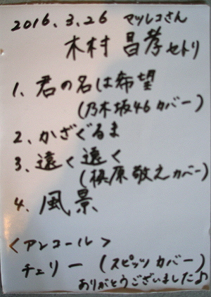 ◆志穂(山鹿) 今月もがんばってまっす。! いったん、引っ込んだ後は、後にボーカリストとして、「FIRE FLY」のサポートという流れ。 来月4月23日(土)300回記念企画に登場予定である。 演奏曲:イージュ☆ライダー(奥田民生)/桜並木(スガシカオ)/ロビンソン(スピッツ)/en:星のかけらを探しに行こう(福耳) |