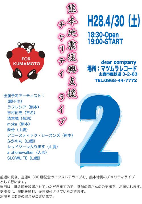 ◆アコースティック・シーズンズ(熊本) 音楽で被災の方々を元気づけるという活動に、TV局(NHK三重)が取材で来店。 5月2日に熊本で、後日、全国放送でもオンエアされるようです。 自らの体験等、感情も深く込めの歌声。 演奏曲:やさしく歌って/STORY/ジョワン |