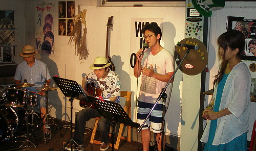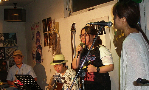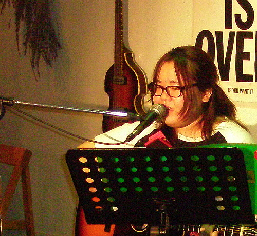 しっかりと透明感ある歌声はもちろんながら、最近はギターも良くなってきたね〜と評判の「志穂」。 曲の後、ギター教室で練習中の二人が加わっての1曲という流れ。 いう。展開にミスがありましたが、それも課題として、次へのステップです。 演奏曲:イージューライダー(奥田民生)/水芭蕉(森山直太朗)/あくび(スガシカオ)/卒業写真(荒井由実) |