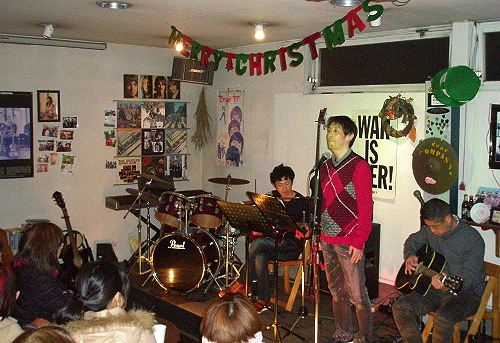 ◆333(山鹿) じっくり煮込んだフォークソング..というか、定番チューン中心に、懐かしい曲をその雰囲気で堪能させてくれます。 50代〜70代までには落ち着く選曲で、そんな「歌声フォークナイト」も2018年から毎月第3土曜/午後7時〜店内で実施。サポートに「333」も加わって、楽しく歌い/弾くという流れ、歌いたい方、ギターを弾きたい方など気軽にご参加ください。 「クリスマスにはフォークソングを」はみんなで合唱の楽しめるナンバー、昨年に続いて今年も盛り上がりました〜。 演奏曲:シクラメンのかほり(小椋佳) |