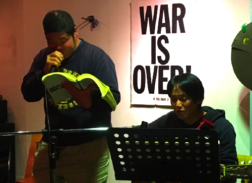 今回は、翌日開催のフォークジャンボリーの前夜祭という企画ながら、なかなかメンツも揃わない状況にもかかわらず、積極的に参戦してくれたサザン・コンフォートのお三方、誠にありがとうございます〜。 演奏曲:Aのブルース/夢/熱い部屋/メインストリート/ホンキと聞くウイメン・・・その他。で、最後は 歩道橋 1時間の熱いステージで盛り上がった後は、フリーライブに突入。 |
