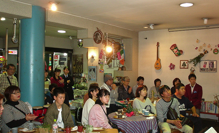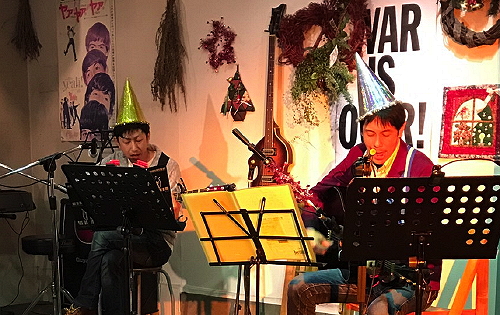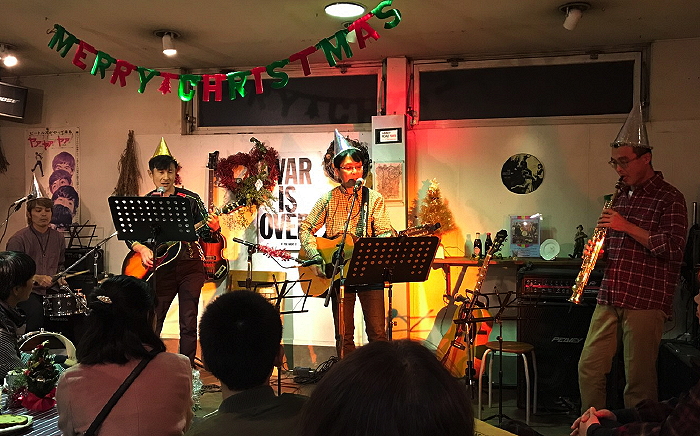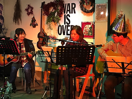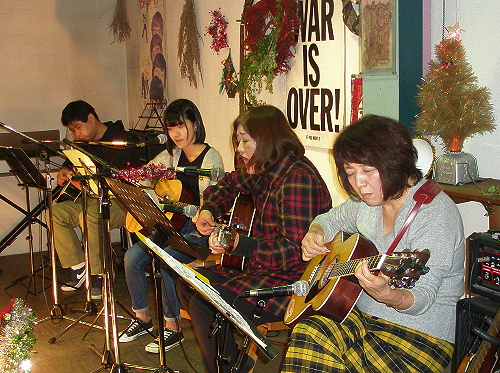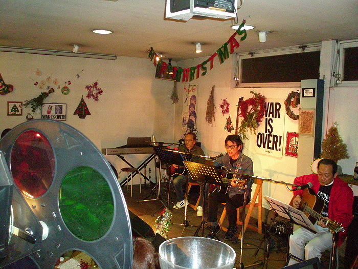 5> 333(山鹿) おなじみの定番フォークソングを聞かせ、オリジナル「クリスマスにはフォークソングを」での盛り上がりに続き、最後はクリスマス定番「HAPPY CHRISTMAS/WAR IS OVER」の合唱という展開で、満員の客席も盛り上がりました。 ありがとうございました。 |