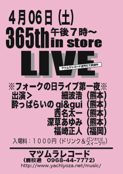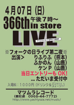 4月7日 出演:りふりふ(熊本) 松見こうすけ(山鹿) Recorage(山鹿) ふかのん(山鹿) |