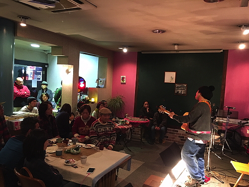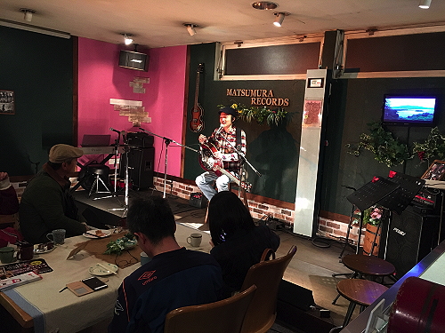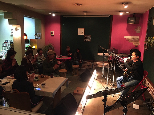 本名改め「のすり」となって、まだしっくりこないんですが・・・ご本人もそんな感じかな?という中、進行は従来通りのフォークテイスト満載の弾き語りスタイル。 |