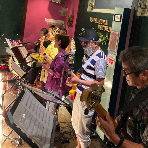 ◆Kapok1215(南関) 本拠地を離れて、アウェイとなる当店でのライブ。 女性ツインボーカルが心地よい響きで、Roseを持って来るとは、驚きでした。 7名というメンバーは当店のステージでは狭かったでしょうが、各パート、存在感ある演奏でした。 |