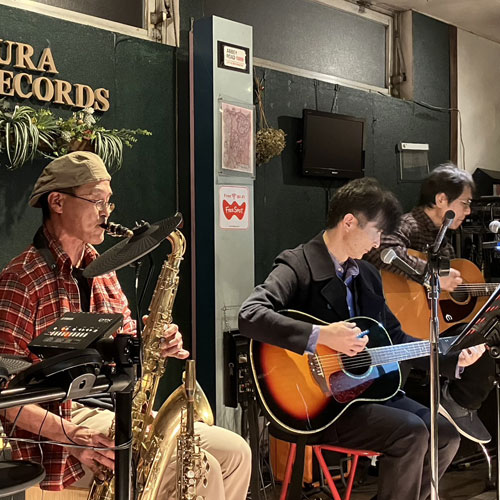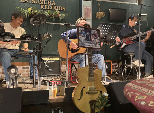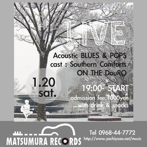 ◆オン・ザ・ドーロ(山鹿) 今年初はここから・・・今年もスタートです。 が、今回は、サザン・コンフォートのギター「ショウ」さんの供養という追悼ライブとなりました。 そして、オン・ザ・ドーロでは革新の動き。 サックス「スガ」さんのカホーン・チャレンジが始まります。 器用な兼業で今後にご期待あれ!今回はまだ手探り状態ですが・・・。 演奏曲: Walking in the rain/America/片想い/誓い/いつかもうすぐ/ 悲しみは雪のように/en:路地裏の少年