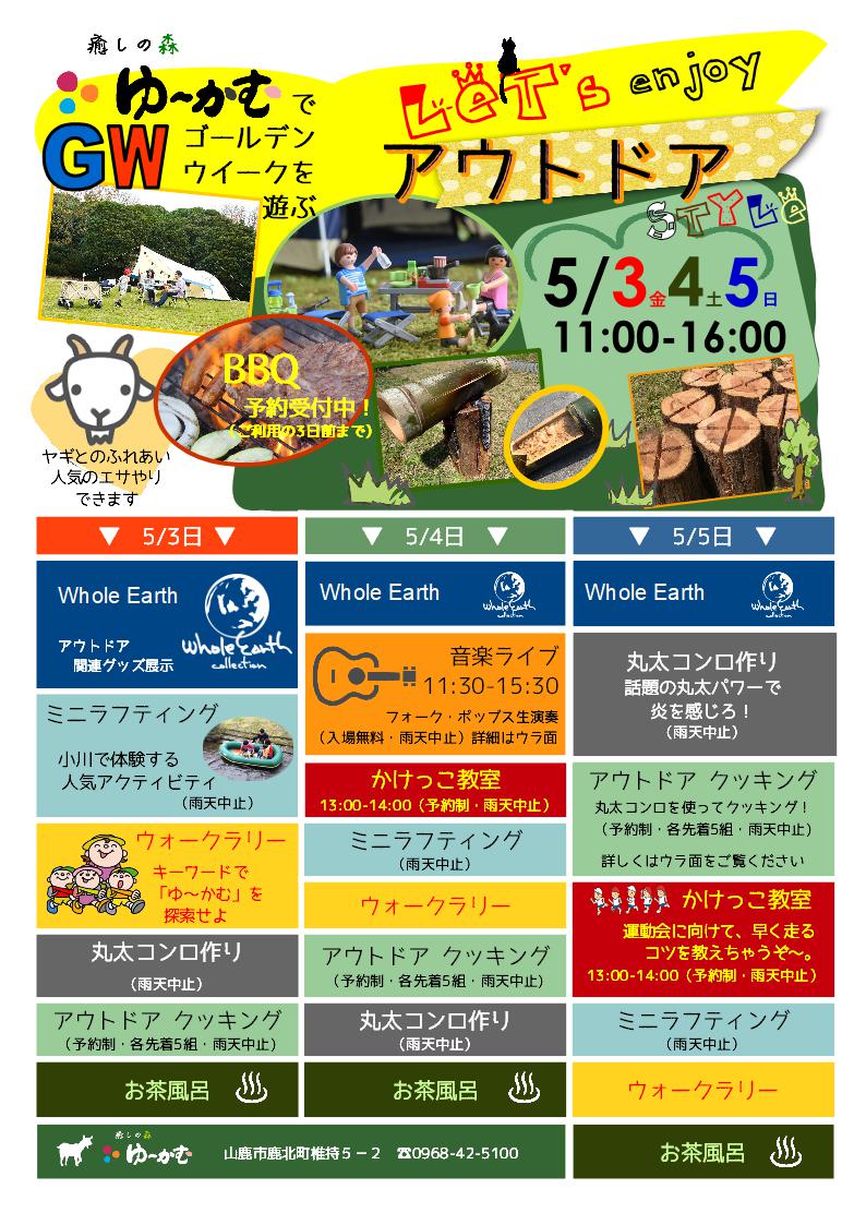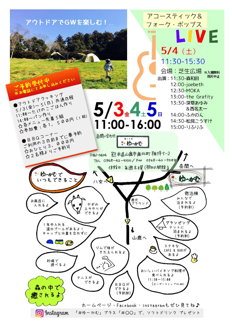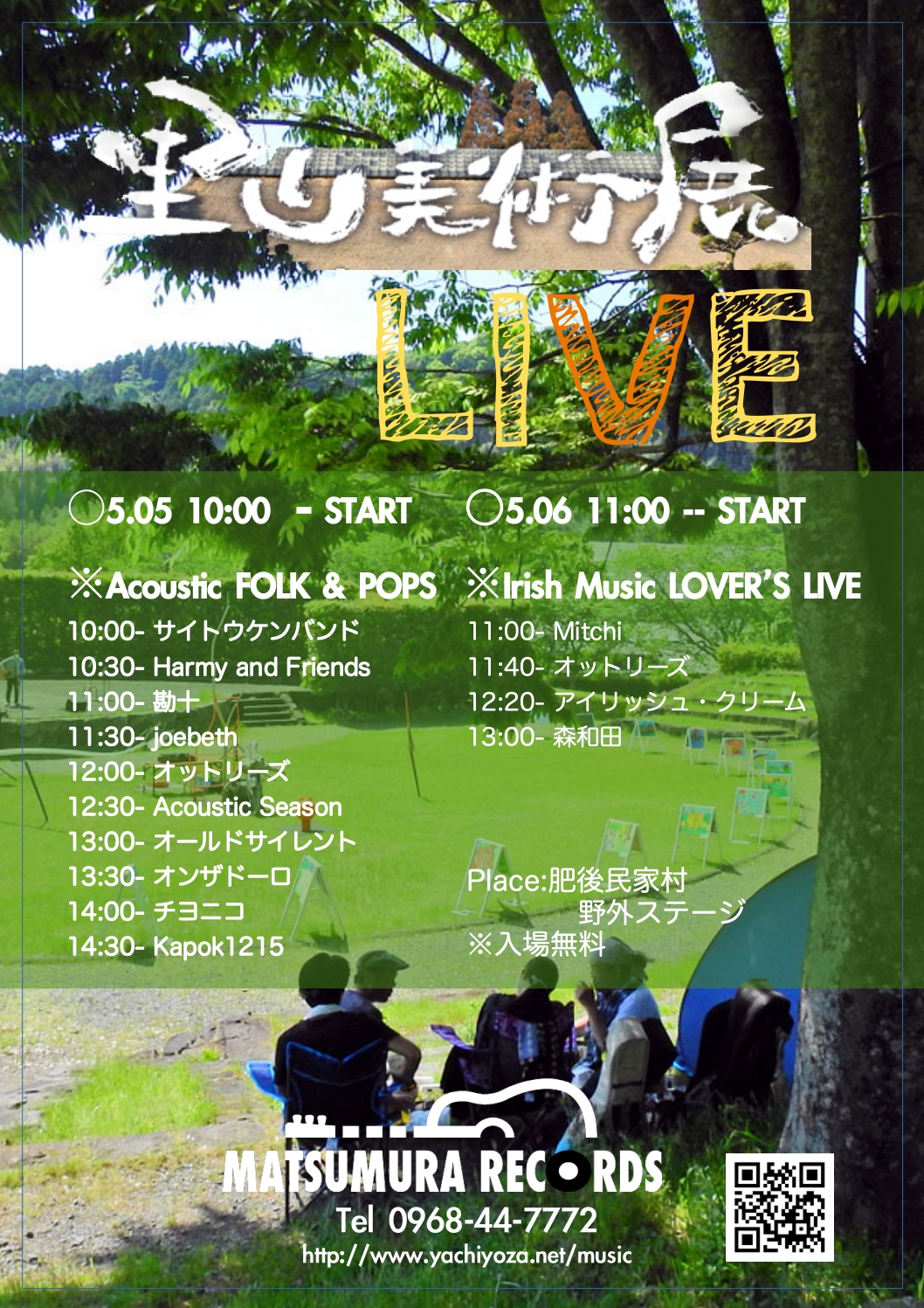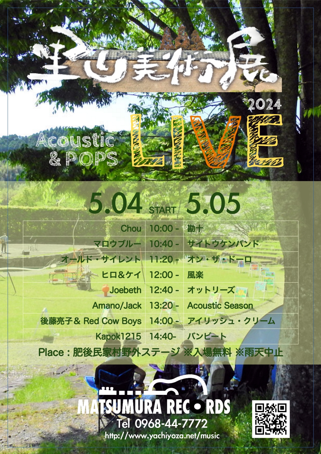 毎年、GW恒例の和水町「肥後民家村」で行われる里山美術展(今年は5月1日〜6日まで開催)、そして今年も2DAYSライブ(5月4日、5日)を実施。 場所:肥後民家村 野外ステージ 雨天中止 入場無料 春の日差しの中、お弁当でも広げて、のんびりとお過ごしください。 ちなみに日差しが強いので、遮光のご用意をおすすめします。 |