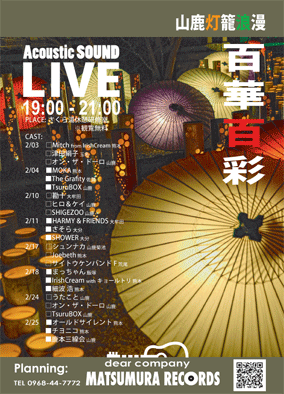 出演> ラフレシア(熊本) 吉村佑亮(玉名)/清本誠(菊池) moka(熊本)/鉄骨(山鹿) アコースティック・シーズンズ(熊本) レッドゾーン入ります(山鹿)/ふかのん(山鹿) a phonewalker(鹿屋)/ SLOWLIFE(山鹿) |