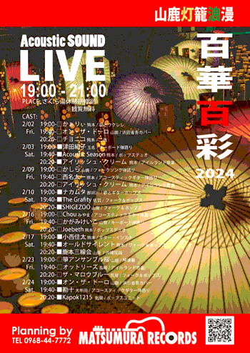 出演>かしら(山鹿) 勘十(大牟田) オン&オフ・ザ・ドーロ(山鹿) サザン・コンフォート(熊本) Acoustic Shower(熊本) オーシャンズ(熊本) |