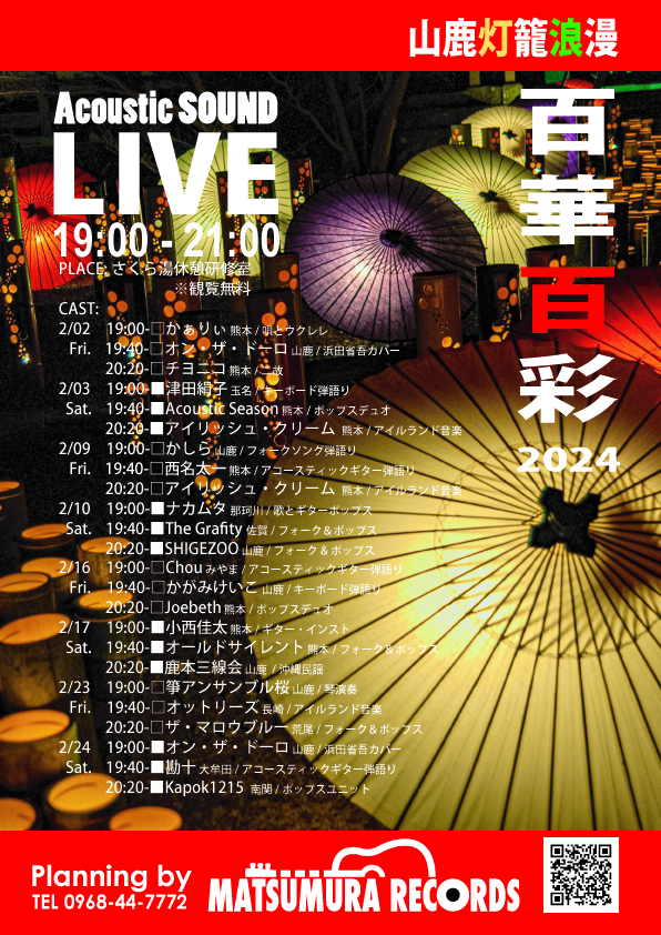 2024「百華百彩」ライブ =出演者決定! 会場:さくら湯 豊前街道沿い/休憩室ステージ(無料イベント)※防寒をご用意ください (期間中<2月>/毎・金/土曜日 午後7時00分〜9時00分/雨天時は中止、または、休憩室内の場合も有) 出演順(予定)