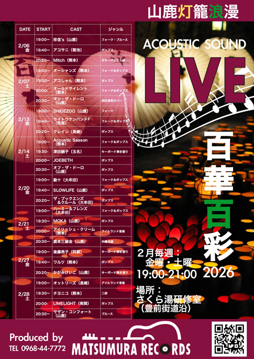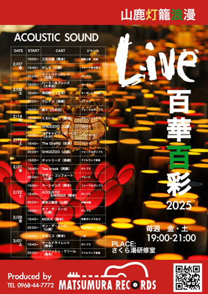 2025「百華百彩」ライブ =出演者決定! 会場:さくら湯 豊前街道沿い/研修室ステージ(無料イベント)※防寒をご用意ください (期間<2月7日〜3月1日>/毎・金/土曜日 午後7時00分〜9時00分/雨天時は中止場合も有) 出演順(予定)